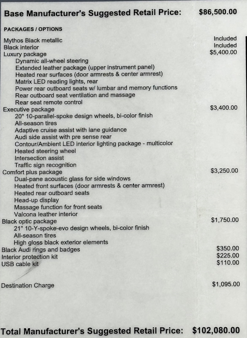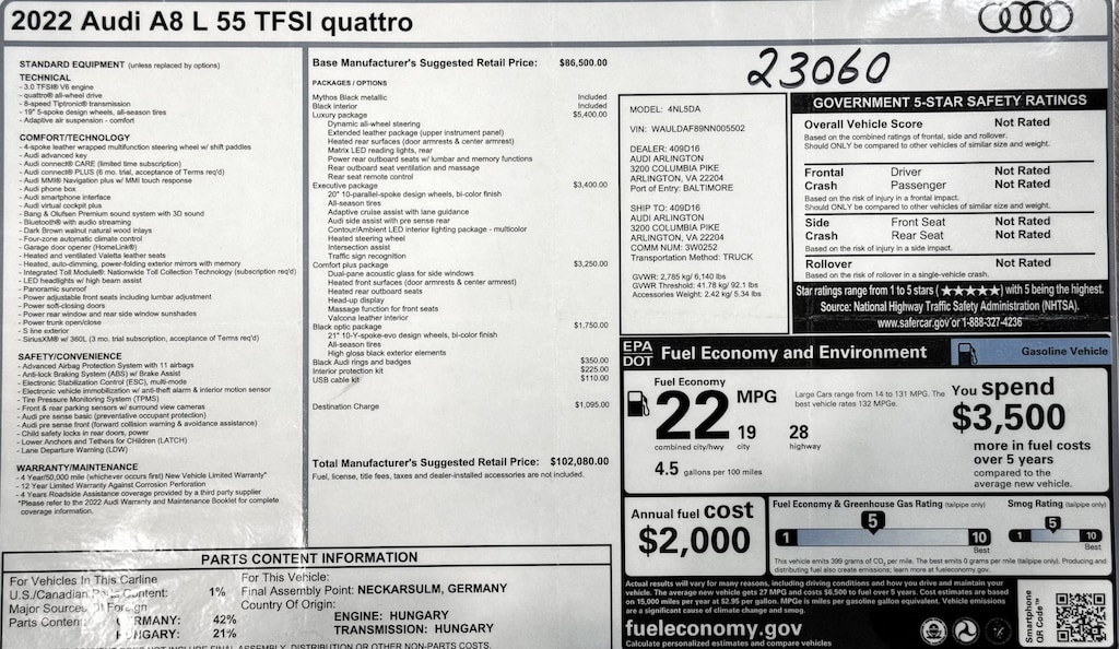 ORIGINAL MSRP $102,080.00*OVER $14,000 in OPTIONS:*Comfort Plus Package ($3,250)*Executive Package ($3,400)*Luxury Package ($5,400)*Black Optic PKG ($1,750)*3.0L V6 335 HP*Bang & Olufsen Premium 3D Surround Sound System*Panorama Roof*4 Brand New Tires.*Select Auto Imports in Alexandria, VA. 703-971-9100 *CLEAN CARFAX REPORT. We are the only dealer in the Eastern United States that guarantees in writing that all our Certified vehicles have no frame damage and no body panel replacements. *Several more to choose from as well. We can arrange to ship your car Nationwide. Please contact us for more details. 1-877-971-9100 sales@selectautoimports.com Select Auto Imports, 5630 South Van Dorn St, Alexandria, VA 22310-RECALL NOTICE: Some vehicles may be subject to manufacturer safety recalls that for various reasons may not be repaired prior to sale. You may also check for open recalls at www.safercar.gov All prices are subject to change without prior notice and are exclusive of any State or County fees and taxes for all buyers, in state and out. There will be fees applied to your final purchase price along with a Processing Fee of $995.00. (Not required by law). (Please note that on most used cars we do not have the original MSRP label that came with the car. We contract with a third-party company to recreate them for us. While they are generally accurate and reliable, we cannot guarantee that they are the exact replica of the original)