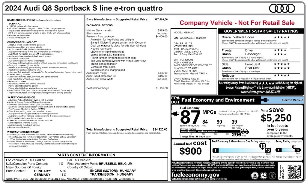 ORIGINAL MSRP $84,820.00*Premium Plus Package ($4,400)*Mythos Black Metallic ($595)*Audi Beam "rings" ($485)*296 MILES of Range*Select Auto Imports in Alexandria, VA. 703-971-9100 *CLEAN CARFAX REPORT. We are the only dealer in the Eastern United States that guarantees in writing that all our Certified vehicles have no frame damage and no body panel replacements. *Several more to choose from as well. We can arrange to ship your car Nationwide. Please contact us for more details. 1-877-971-9100 sales@selectautoimports.com Select Auto Imports, 5630 South Van Dorn St, Alexandria, VA 22310 -RECALL NOTICE: Some vehicles may be subject to manufacturer safety recalls that for various reasons may not be repaired prior to sale. You may also check for open recalls at www.safercar.gov All prices are subject to change without prior notice and are exclusive of any State or County fees and taxes for all buyers, in state and out. There will be fees applied to your final purchase price along with a Processing Fee of $995.00. (Not required by law). (Please note that on most used cars we do not have the original MSRP label that came with the car. We contract with a third-party company to recreate them for us. While they are generally accurate and reliable, we cannot guarantee that they are the exact replica of the original)