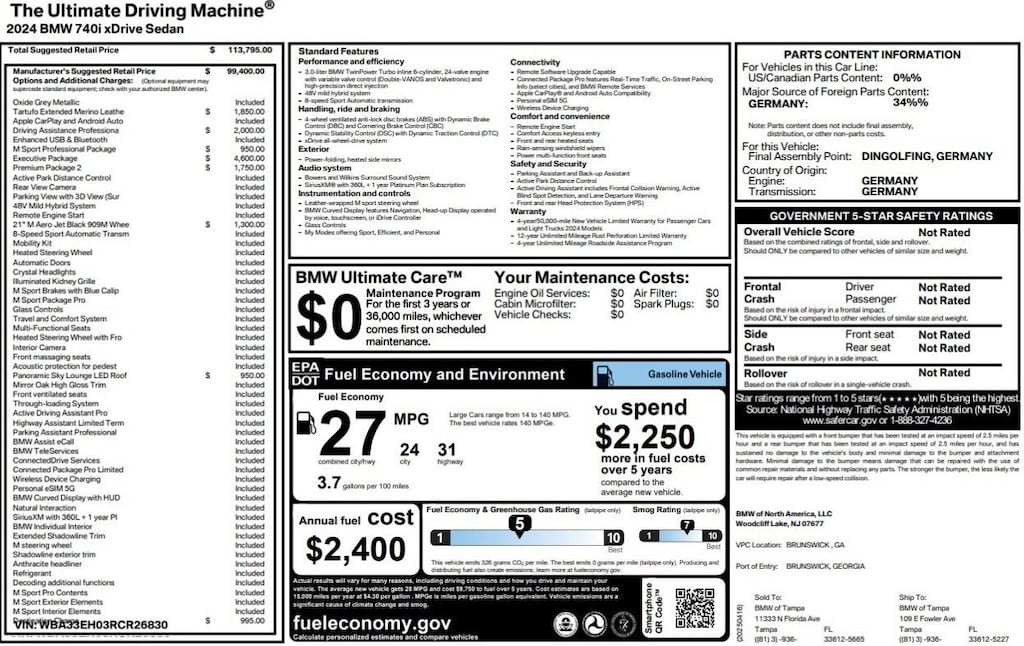 ORIGINAL MSRP $113,795.00*Still under FULL Factory Warranty up to 01-10-2028 or 50,000 Miles, Whichever comes first.*Executive Package ($4,600)*Driving Assistance Professional Package ($2,000)*Tartufo Extended Merino Leather ($1,850)*Premium Package 2 ($1,750)*21" M Aero Jet Black 909M Wheels ($1,300)*M Sport Professional Package ($950)*Panoramic Sky Lounge LED Roof ($950)*Select Auto Imports in Alexandria, VA. 703-971-9100 *CLEAN CARFAX REPORT. We are the only dealer in the Eastern United States that guarantees in writing that all our Certified vehicles have no frame damage and no body panel replacements. *Several more to choose from as well. We can arrange to ship your car Nationwide. Please contact us for more details. 1-877-971-9100 sales@selectautoimports.com Select Auto Imports, 5630 South Van Dorn St, Alexandria, VA 22310 -RECALL NOTICE: Some vehicles may be subject to manufacturer safety recalls that for various reasons may not be repaired prior to sale. You may also check for open recalls at www.safercar.gov All prices are subject to change without prior notice and are exclusive of any State or County fees and taxes for all buyers, in state and out. There will be fees applied to your final purchase price along with a Processing Fee of $995.00. (Not required by law). (Please note that on most used cars we do not have the original MSRP label that came with the car. We contract with a third-party company to recreate them for us. While they are generally accurate and reliable, we cannot guarantee that they are the exact replica of the original)