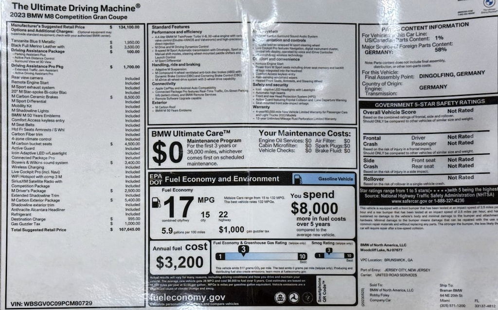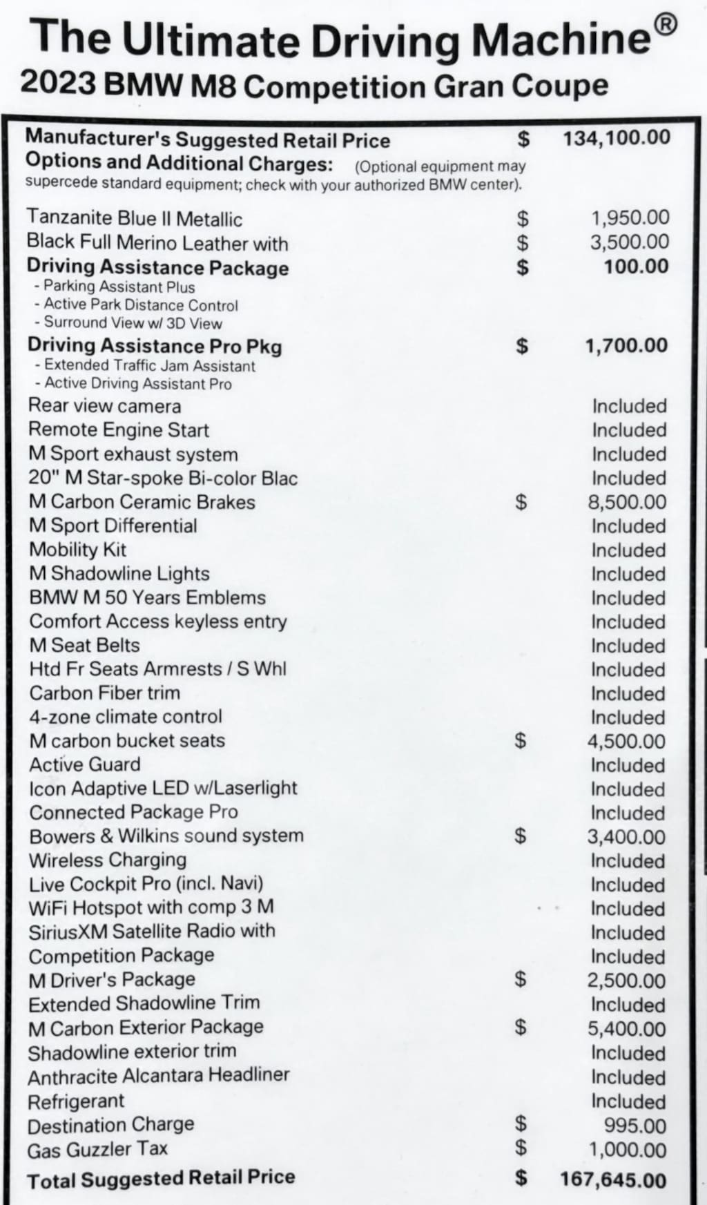 ORIGINAL MSRP $167,645.00*Still under FULL Factory Warranty up to 06-13-2027 or 50,000 Miles, whichever comes first.*One of the most impressive M8 Competition Gran Coups in the market with OVER $30,000 in "Special Order" Options:*M Carbon Exterior Package ($5,400)*Driving Assistance Pro Package ($1,700)*M Carbon Ceramic Breaks ($8,500)*M Carbon Bucket Seats ($4,500)*Bowers & Wilkins Diamond Surround Sound System ($3,400)*Tanzanite Blue II Metallic ($1,950)*Black Full Merino Leather with Sakhir Orange & Alcantara Upholstery ($3,500)*Select Auto Imports in Alexandria, VA. 703-971-9100 *CLEAN CARFAX REPORT. We are the only dealer in the Eastern United States that guarantees in writing that all our Certified vehicles have no frame damage and no body panel replacements. *Several more to choose from as well. We can arrange to ship your car Nationwide. Please contact us for more details. 1-877-971-9100 sales@selectautoimports.com Select Auto Imports, 5630 South Van Dorn St, Alexandria, VA 22310 -RECALL NOTICE: Some vehicles may be subject to manufacturer safety recalls that for various reasons may not be repaired prior to sale. You may also check for open recalls at www.safercar.gov All prices are subject to change without prior notice and are exclusive of any State or County fees and taxes for all buyers, in state and out. There will be fees applied to your final purchase price along with a Processing Fee of $995.00. (Not required by law). (Please note that on most used cars we do not have the original MSRP label that came with the car. We contract with a third-party company to recreate them for us. While they are generally accurate and reliable, we cannot guarantee that they are the exact replica of the original)